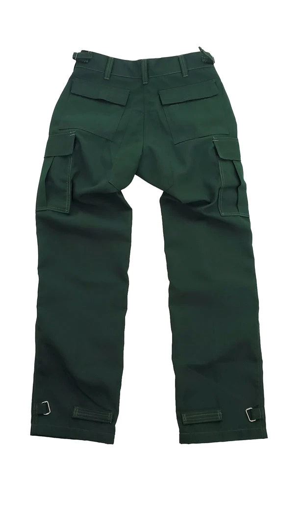 Sold exclusively at The Supply Cache in partnership with CrewBoss, the Premium Supply Cache Nomex Pant is crafted from 6.0 oz. green Nomex. These pants are tough as nails and embody what we have come to expect from a pair of Nomex brush pants. This pant is more than just “gov spec” with slash pockets on both sides, pleated cargo pockets that ride high enough to stay off of the back of your legs and “patch pockets” on the rear. An adjustable waist via 2 side take up straps keeps waist tension precise. We use a #5 brass zipper + metal snap closure up front. A fully reinforced crotch helps prevent blow outs and the CrewBoss triple needle topstitched side seams, inseam and back rise are ultra tough. The knees on our Premium Pant are double up for extra durability, just like brush pants of old. D-Rings with hook & loop straps form the ankle closures.