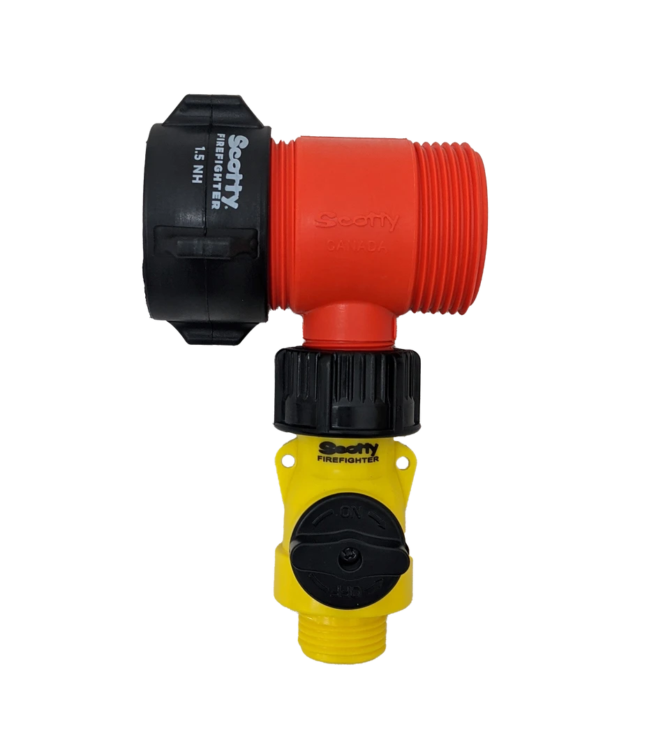The Water Thief is a 1-1/2″ x 1-1/2″ x 3/4″ Tee connector, for connections at intervals in a 1.5″ hose lay. The 3/4″ outlet allows a 3/4″ GHT forestry hose line to be connected for mop-up operations. A shut-off valve makes tapping lines or moving hose easy. Lightweight Scotty Plastics make a great value. Corrosion free and visible at a distance.